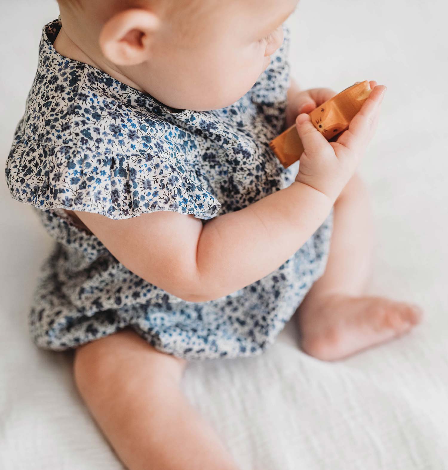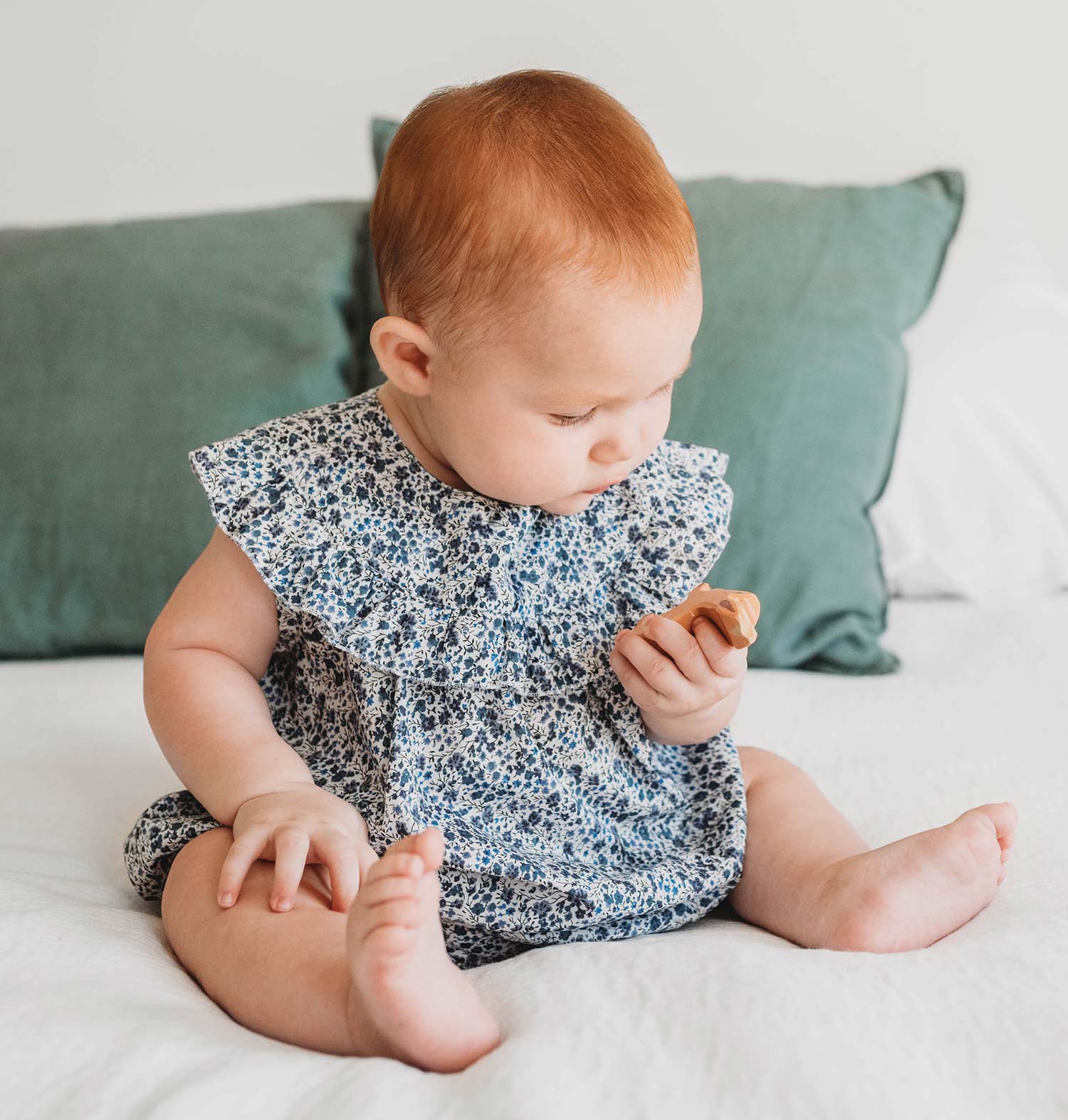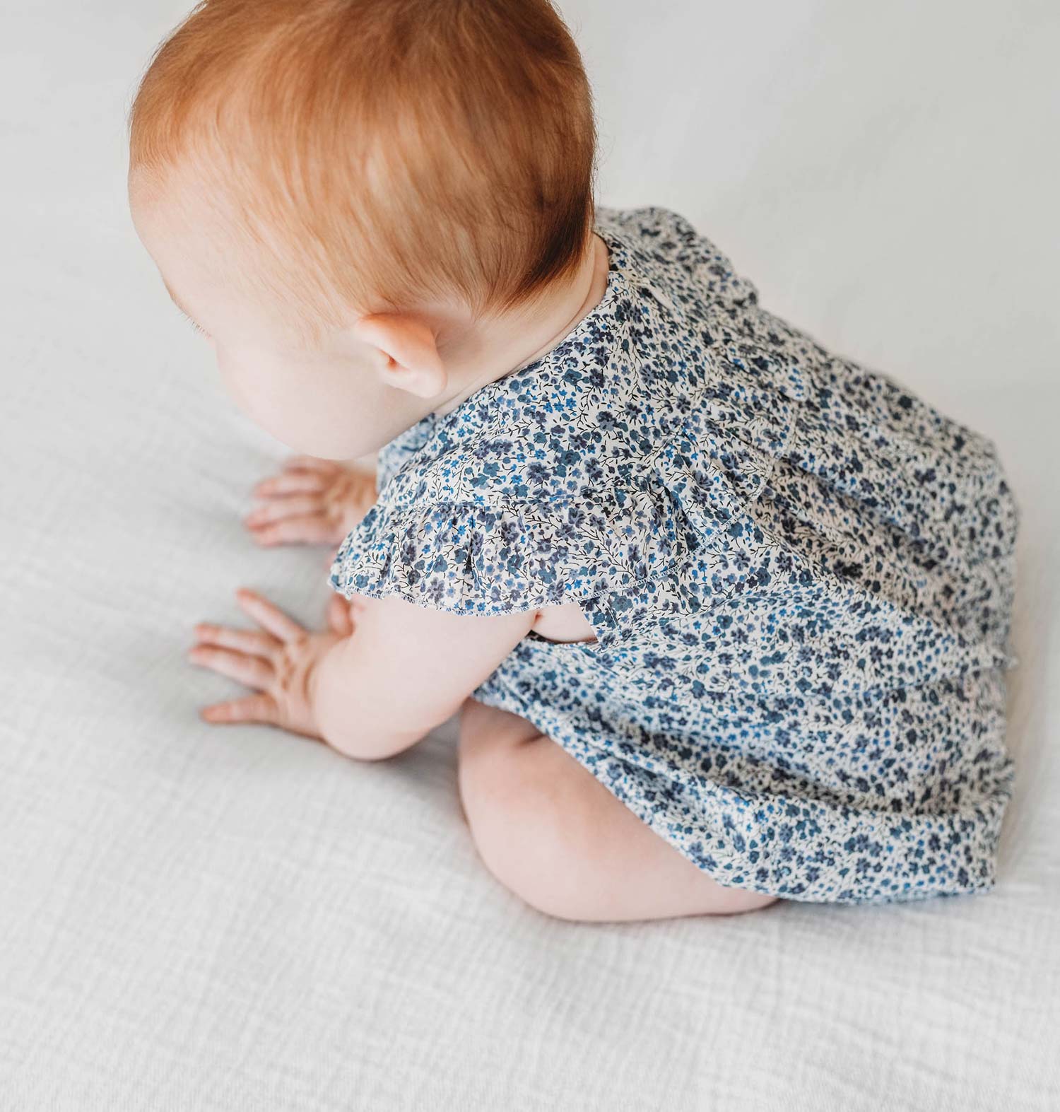 The Elena Romper is a soft floral embrace for your little one. Mother-of-pearl button details and an invisible zipper help simplify changing time. Made with lightweight organic cotton fabric decorated with delicate blue flowers, the Elena Romper is a spring and summer favorite.