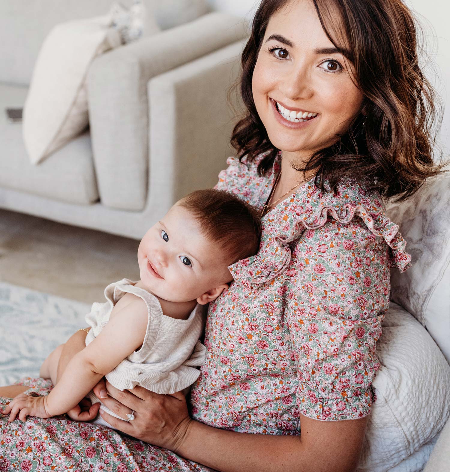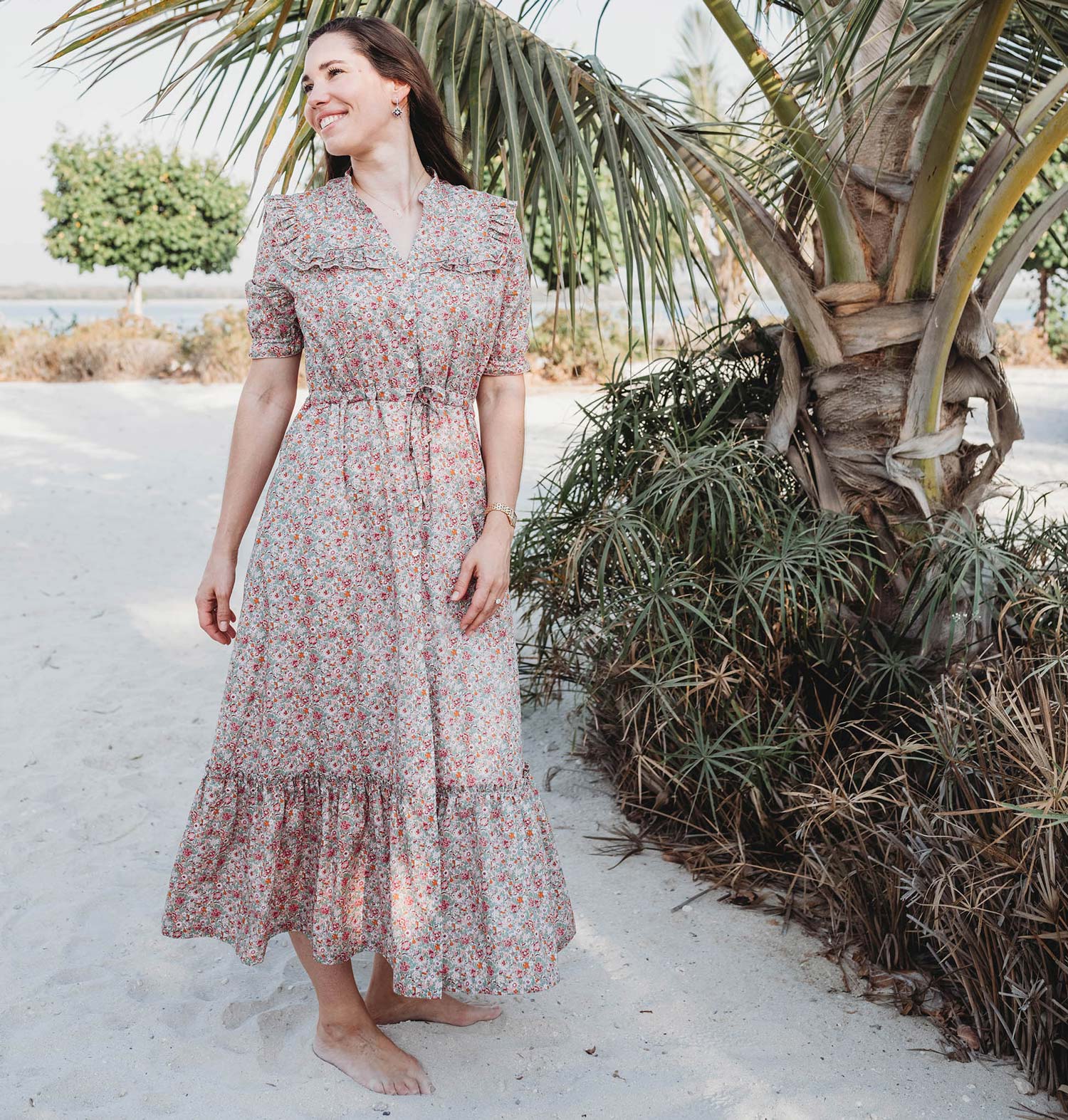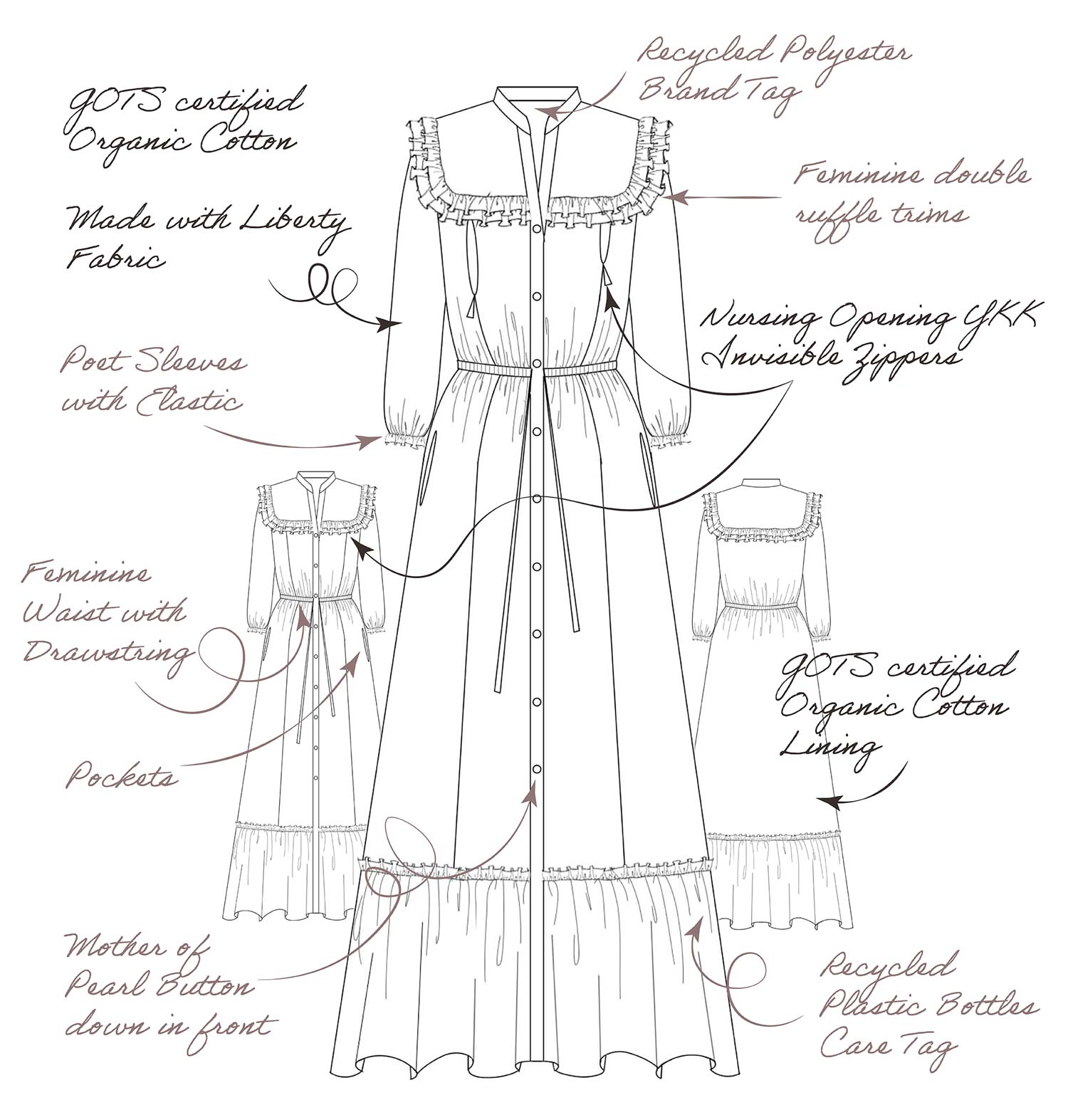 Rejoice in the elegance of another time with our Elizabeth Nursing Dress. Like the Eva Nursing Dress, the Elizabeth Nursing Dress features lovely ruffle details, mother-of-pearl buttons, pockets, and a drawstring that highlights your waist. The classic floral print evokes joyful strolls in springtime meadows, while added conveniences like hidden nursing zippers and deep pockets make caring for your little one a breeze. Made with organic cotton fabric.