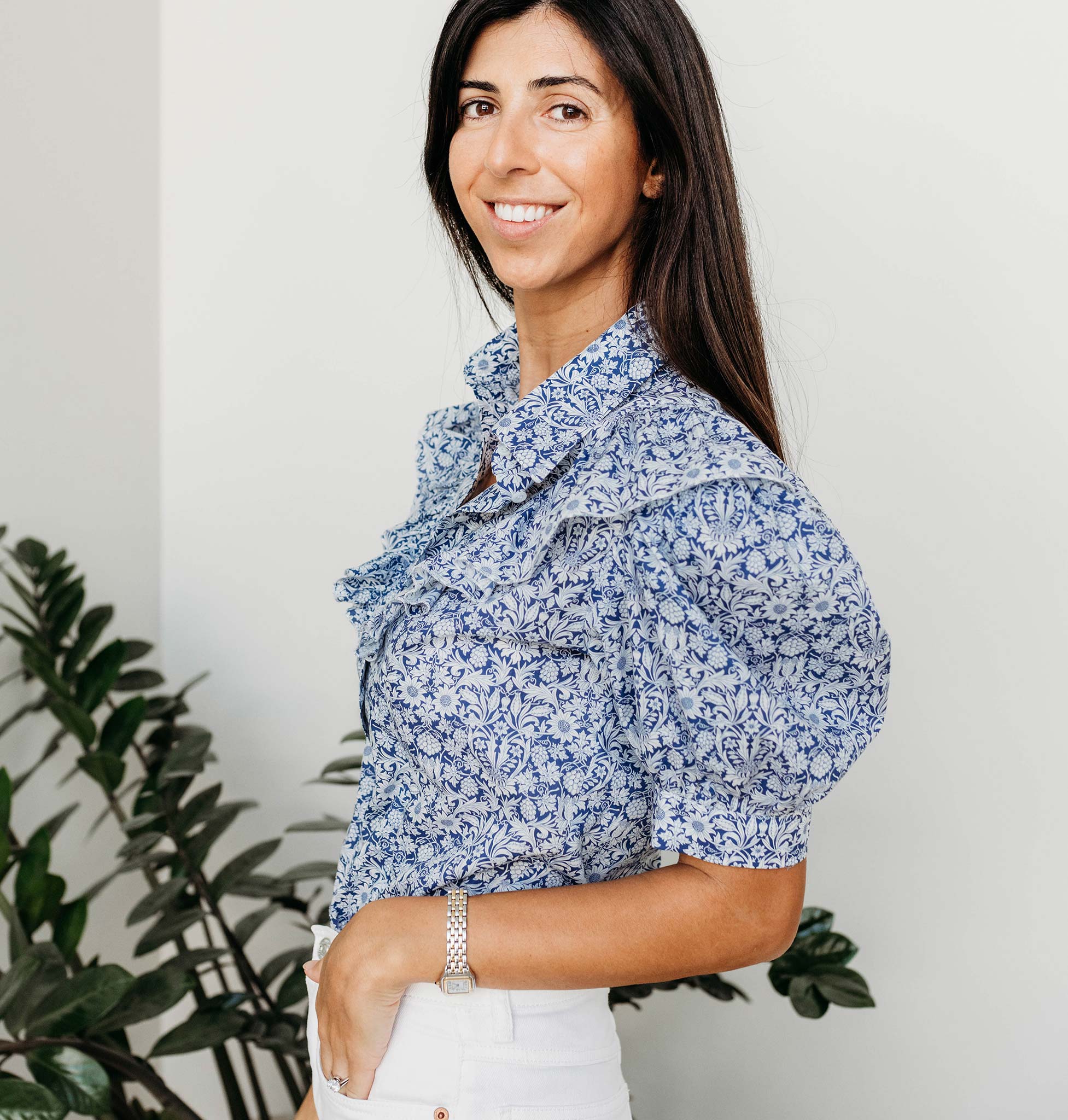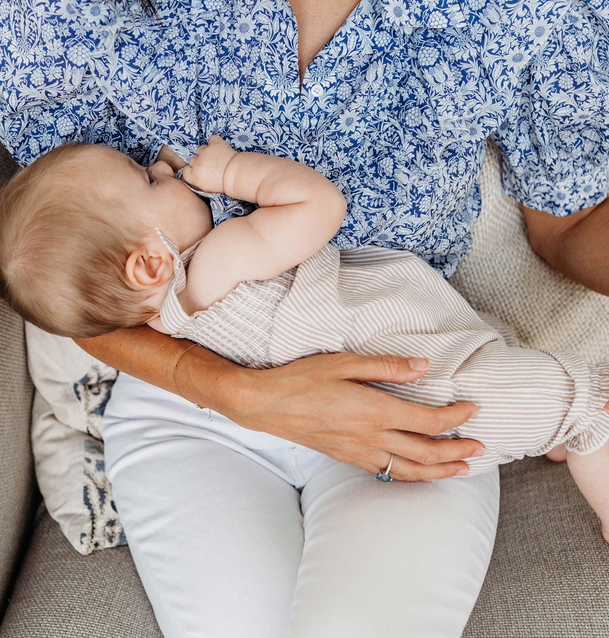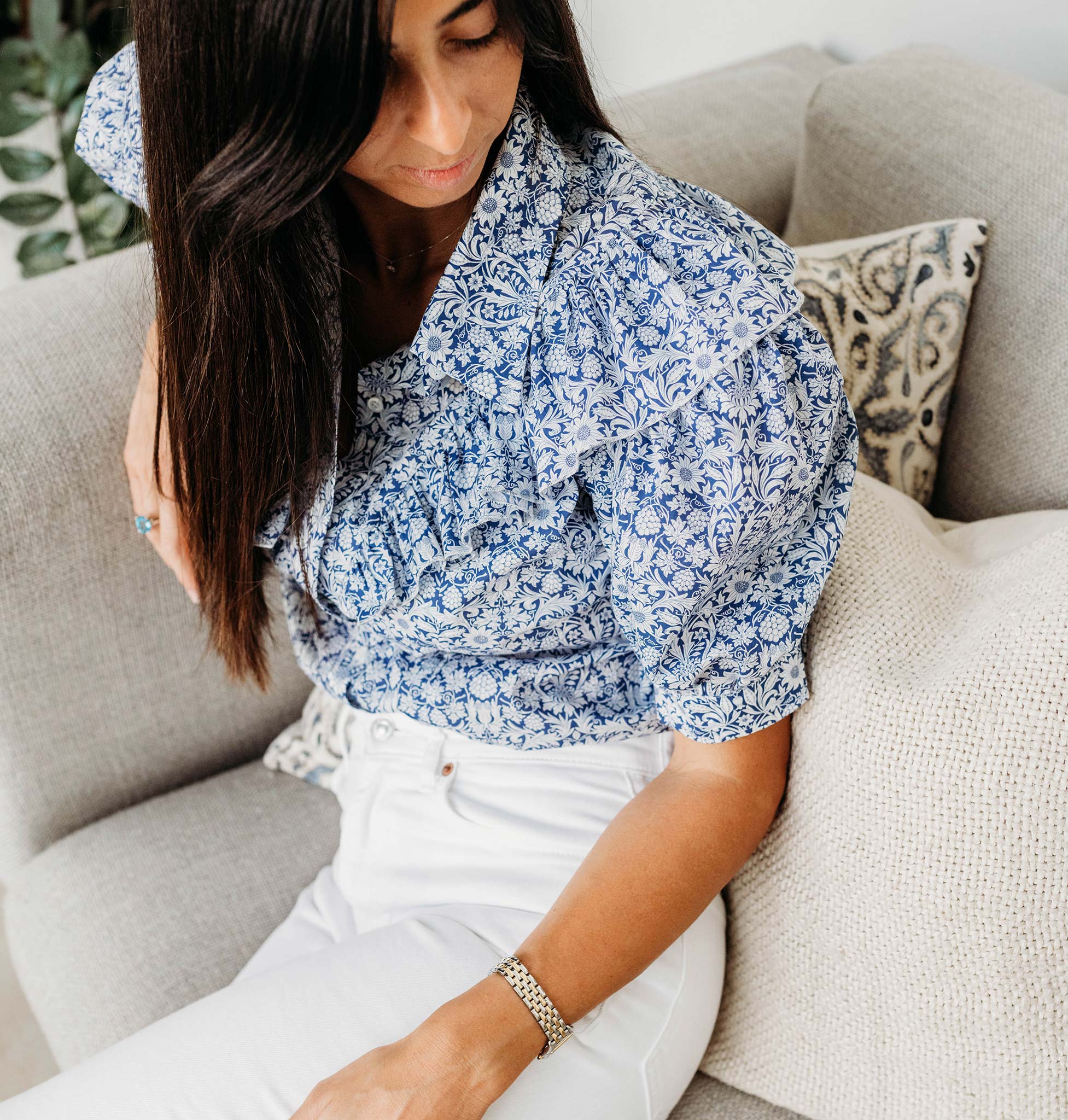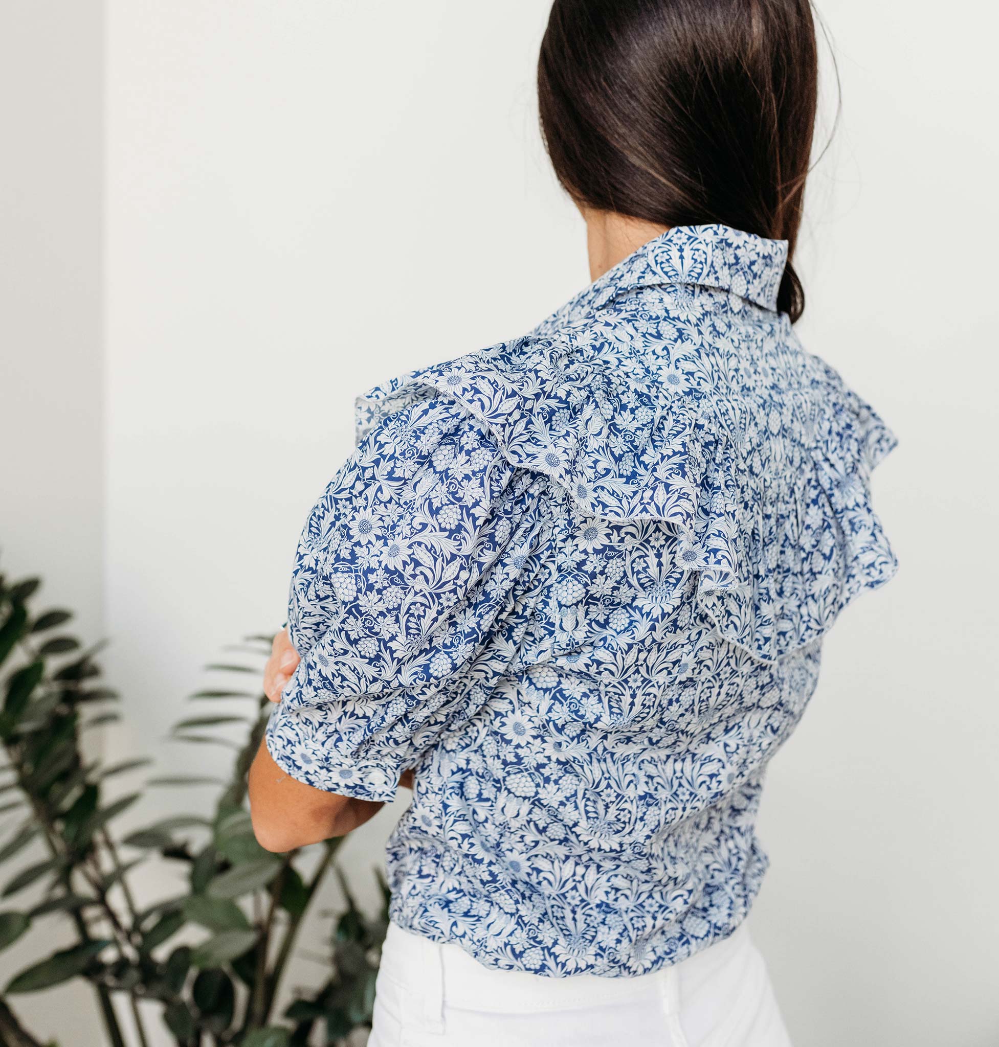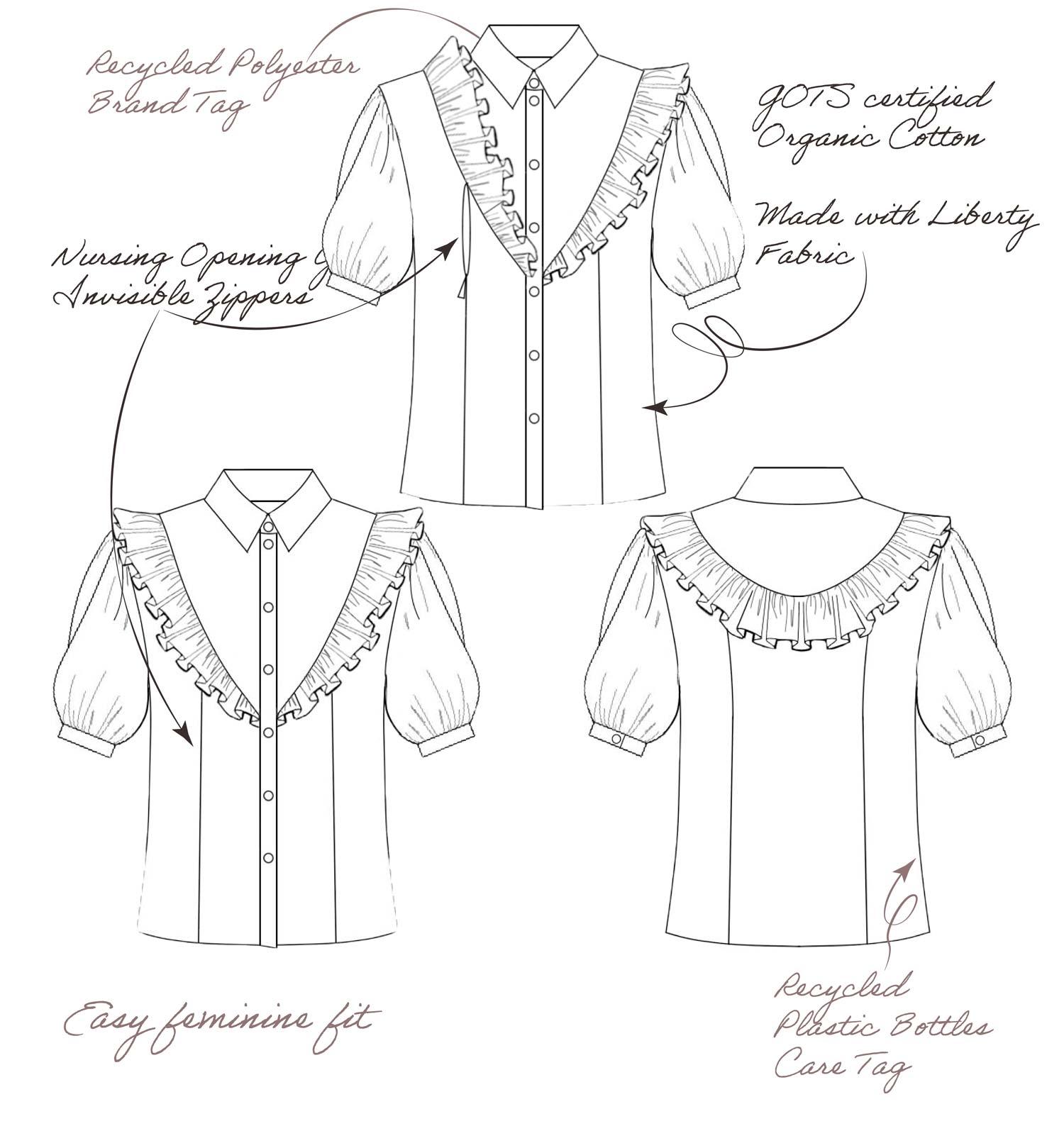 The Sophia Nursing Shirt is both softly elegant and high-fashion, with a sculptural silhouette, mother-of-pearl buttons, and a structured collar over feminine ruffles. White flowers sway against a dazzling blue backdrop, crafted with Tana Lawn organic cotton from Liberty Fabrics. The blouse’s sleeves end above the elbow for ease of movement. An ingenious set of twin zippers is tucked neatly beneath a ruffled front panel, ensuring feeding time is joyful and convenient. As blue as the sky and lighter than air, our Sophia Nursing Shirt will infuse your daily wardrobe with wearable daytime.