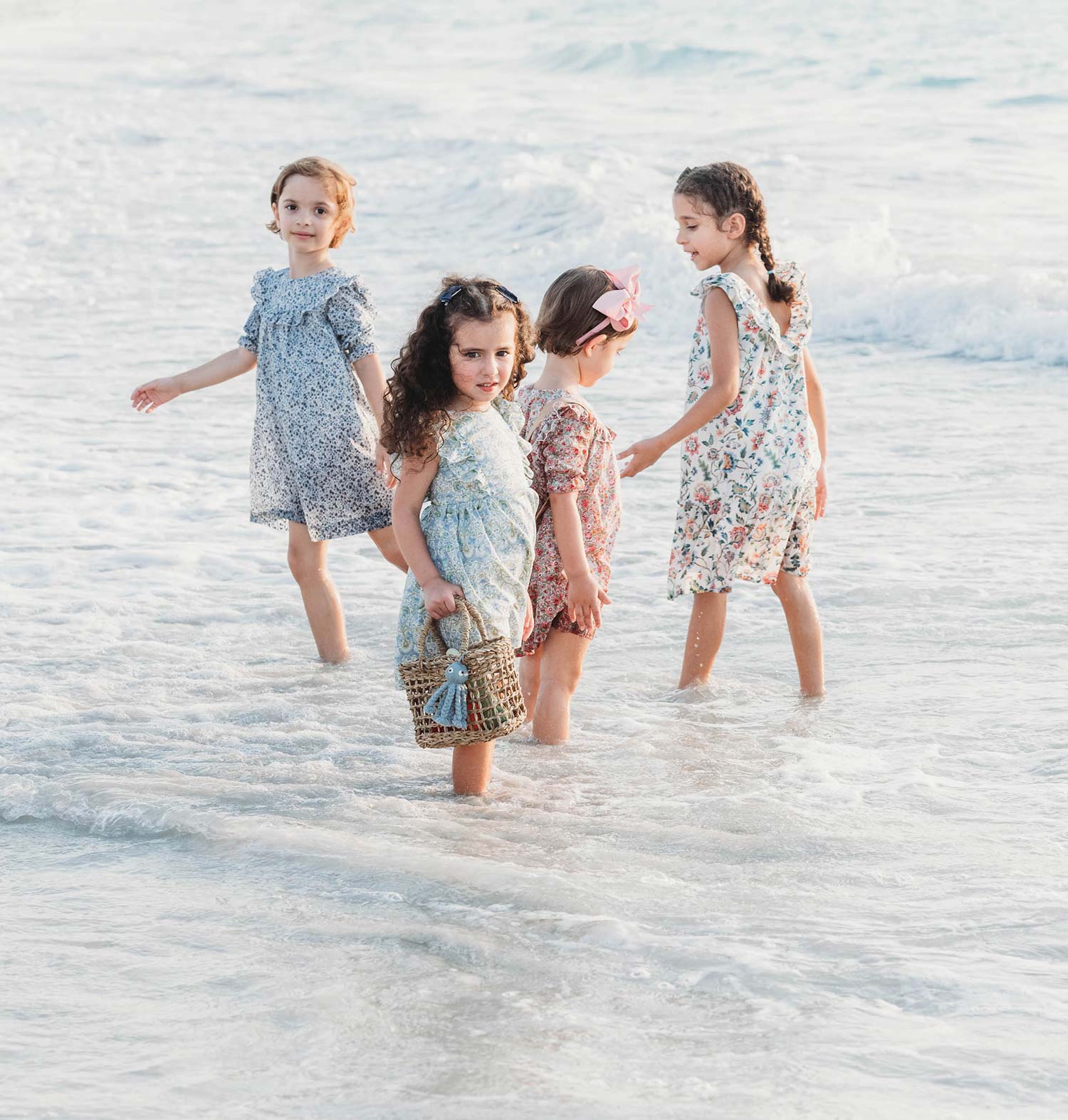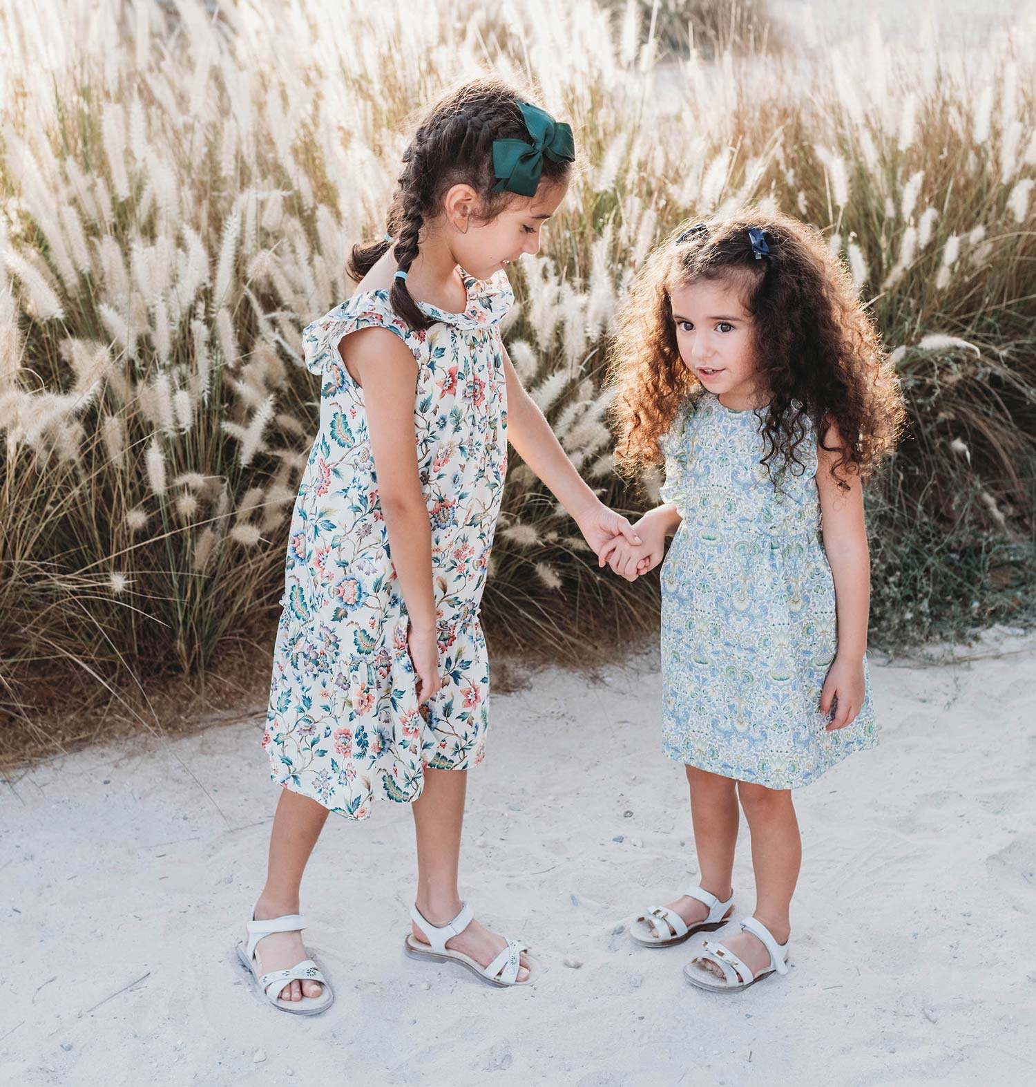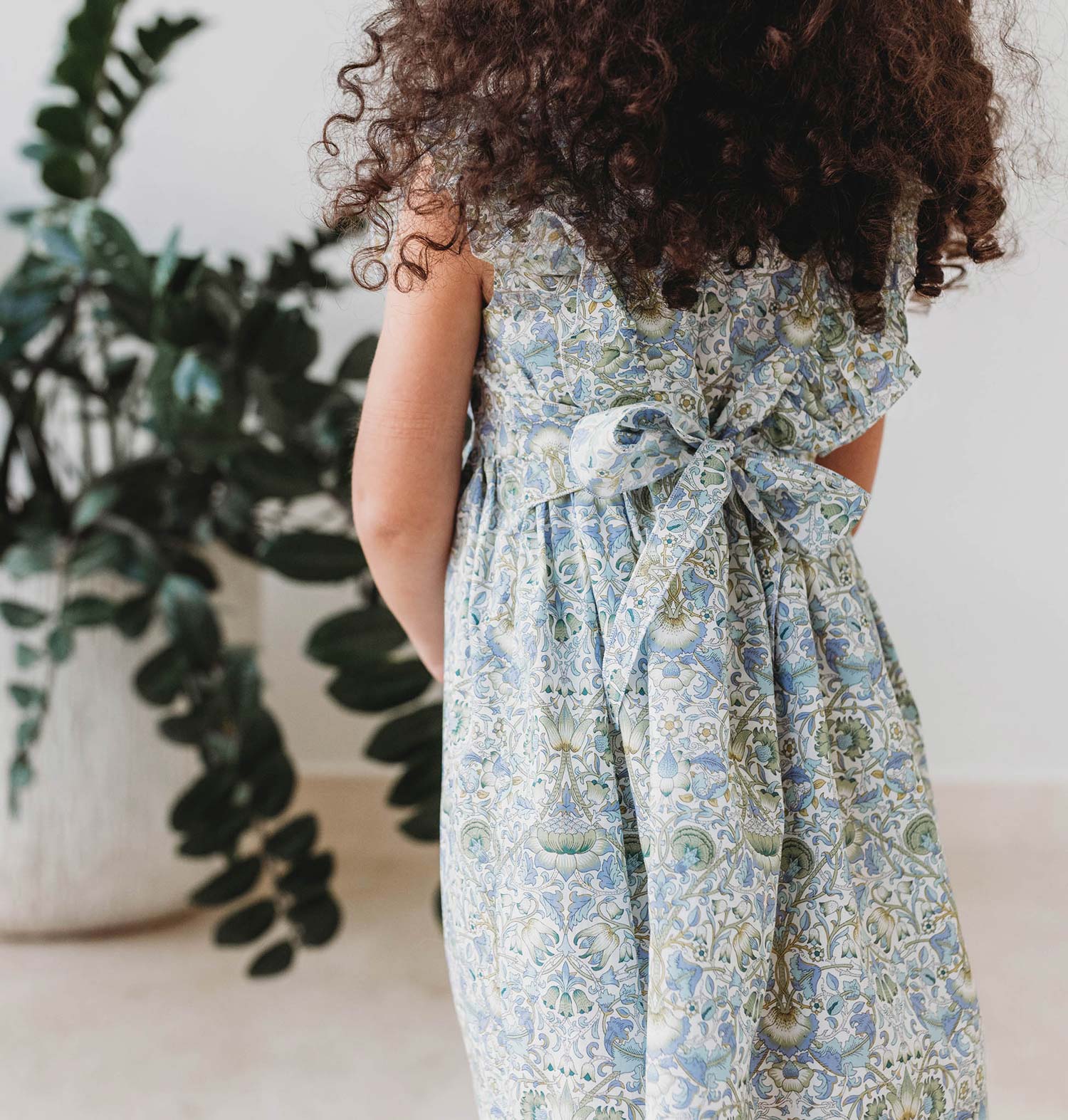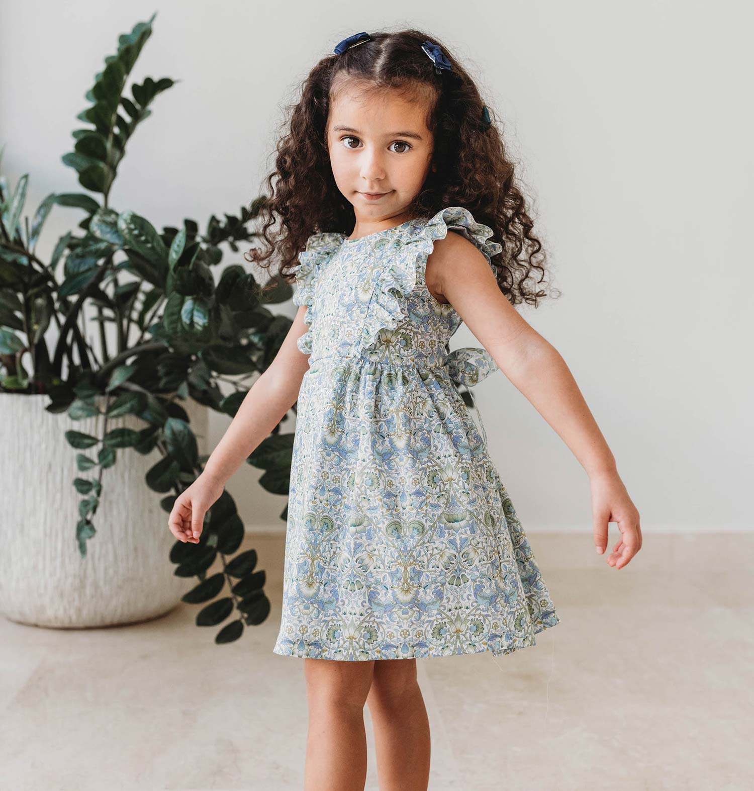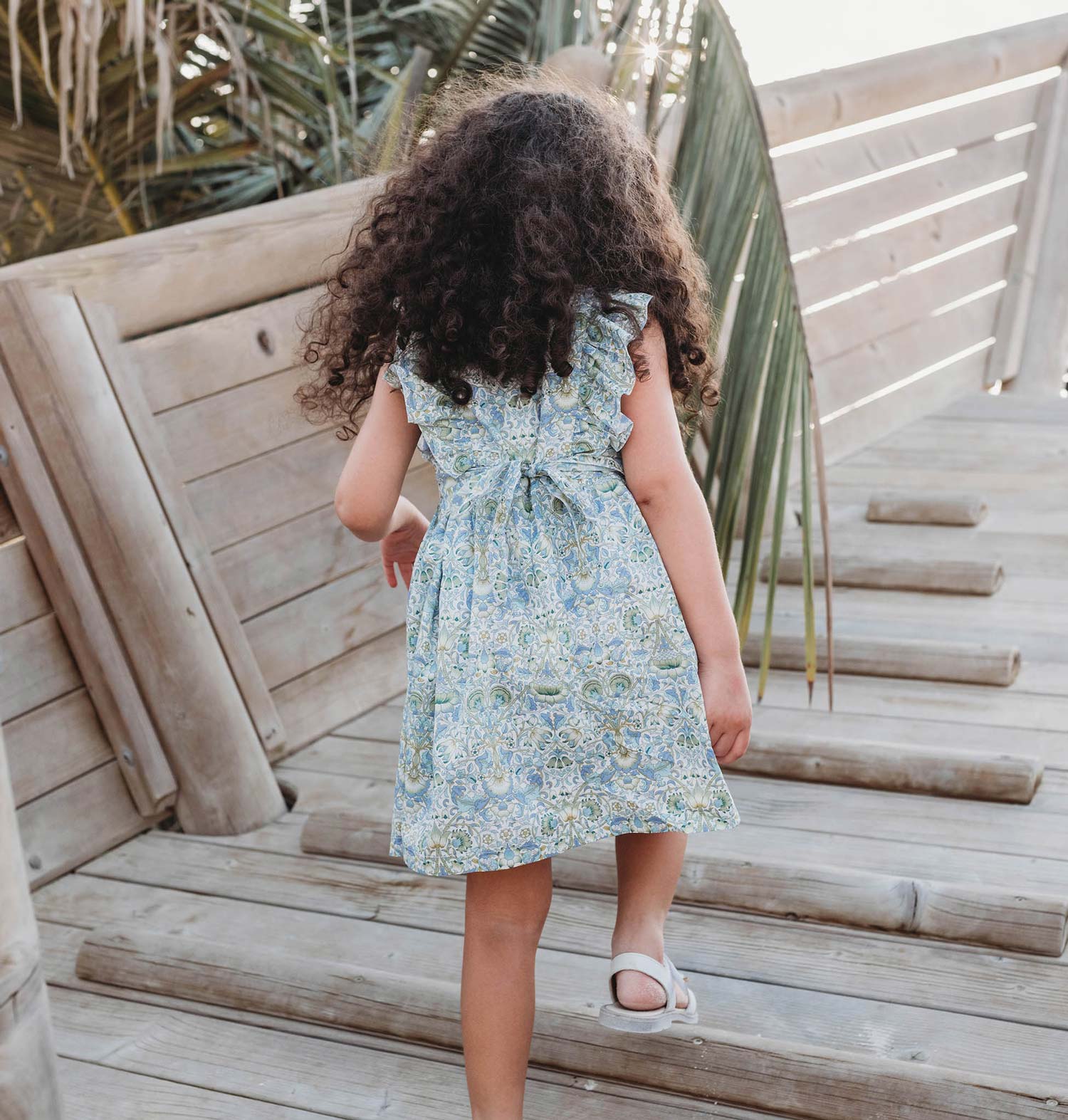 What are little girls made of? Flowers and superpowers, of course! Crafted from organic cotton fabric in a sunny blue-and-yellow print, the Esme Dress was made for flower-powerful little girls. It features a stylish tie waist in the back, and enchanting ruffle details sure to make her grin. With a sleeveless design and an above-the-knee fit, the Esme Dress is perfect for frolicking in fields, gathering blooms, and weaving mother-and-daughter flower crowns.