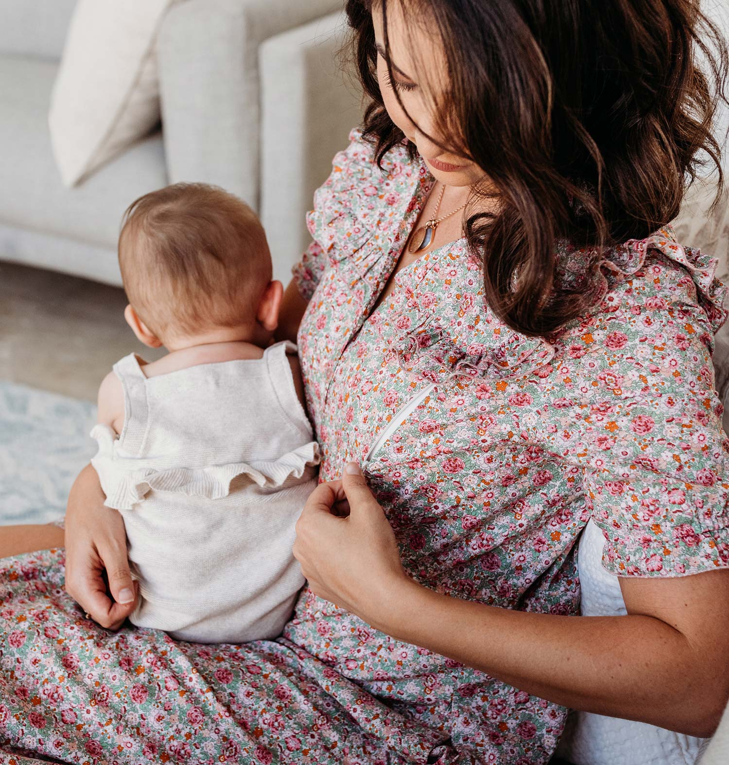Final Sale - No returns, No Exchange The ideal blend of beauty and comfort, our Ella Nursing Dress is naturally stylish and unashamedly feminine. Made from a lightweight organic cotton fabric, it features a tiered skirt, pockets, and front chest ruffles...