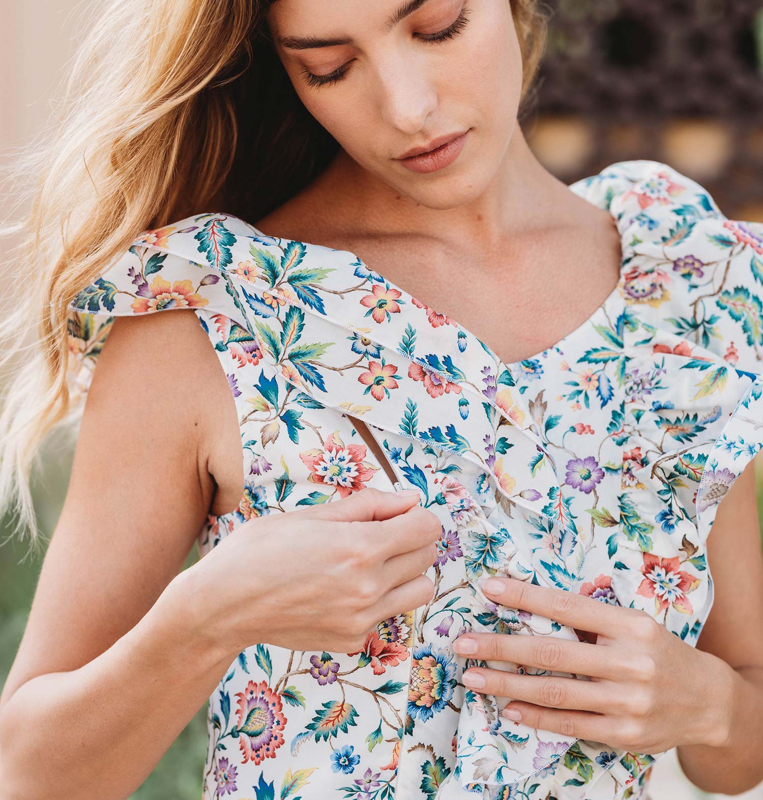 Final Sale - No returns, No Exchange Rejoice in the elegance of another time with our Elizabeth Nursing Dress. Like the Eva Nursing Dress, the Elizabeth Nursing Dress features lovely ruffle details, mother-of-pearl buttons, pockets, and a drawstring that highlights your waist....
