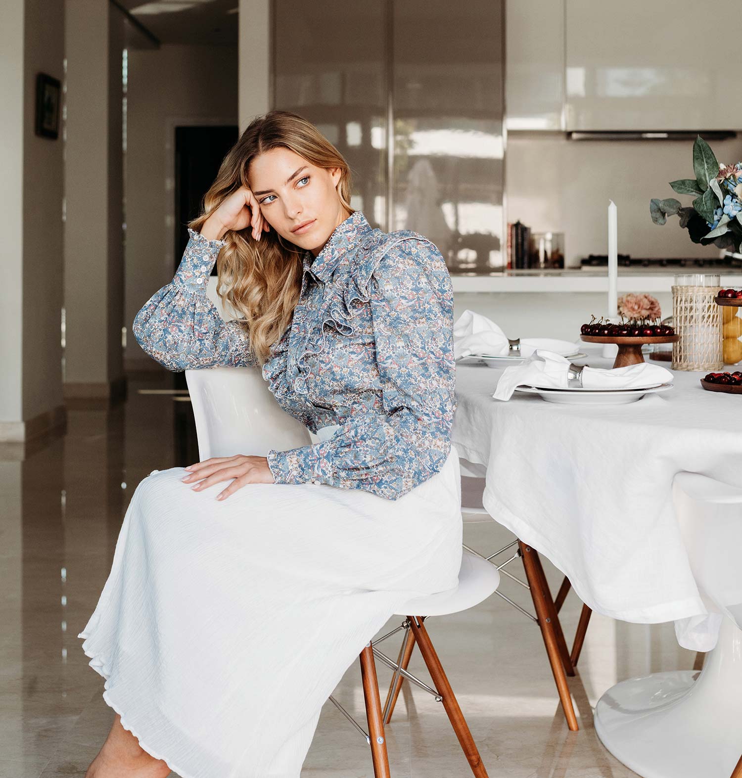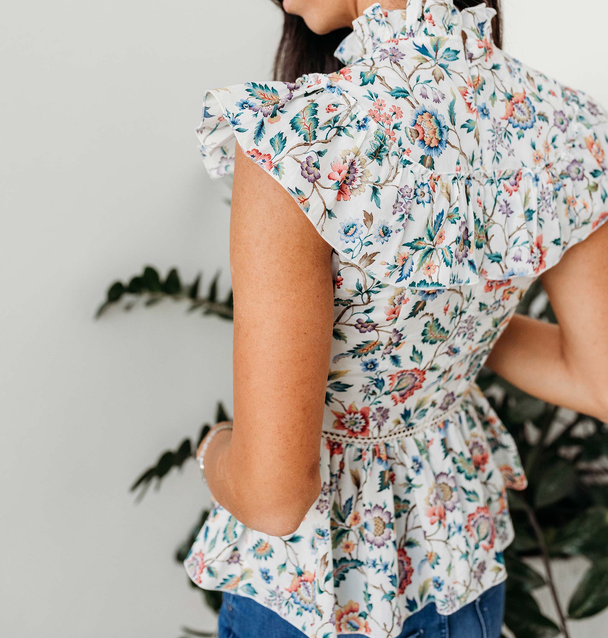Final Sale - No returns, No Exchange The Sophia Nursing Shirt is both softly elegant and high-fashion, with a sculptural silhouette, mother-of-pearl buttons, and a structured collar over feminine ruffles. White flowers sway against a dazzling blue backdrop, crafted with...