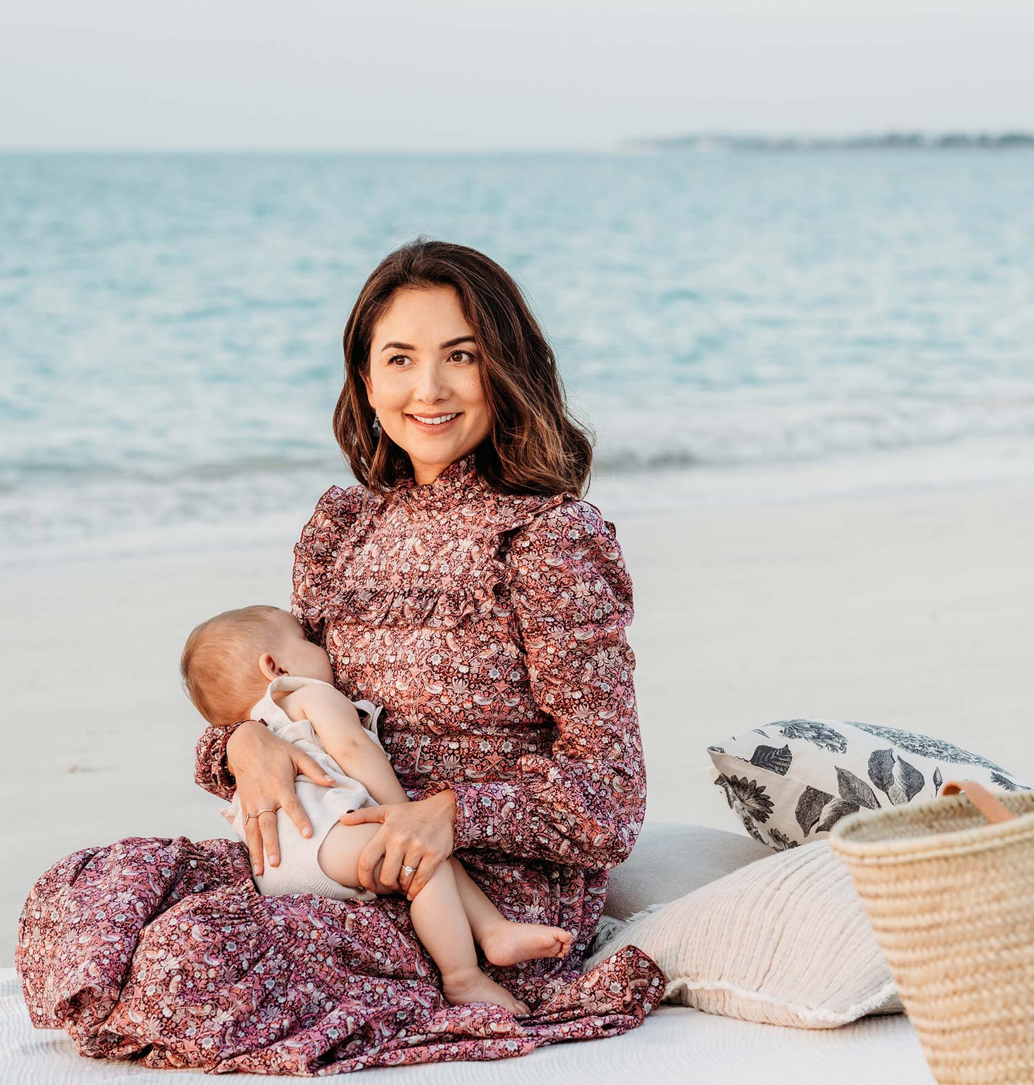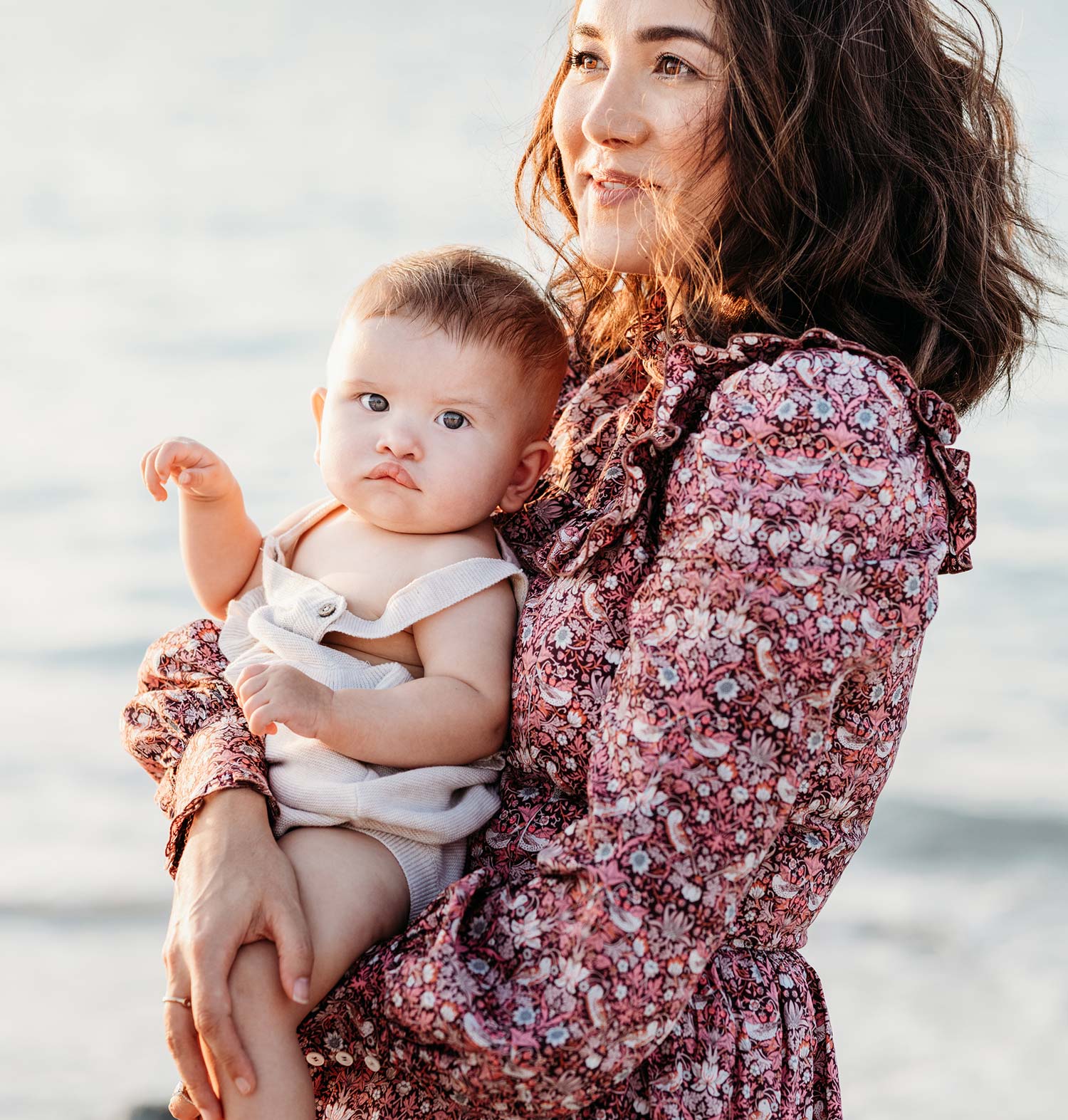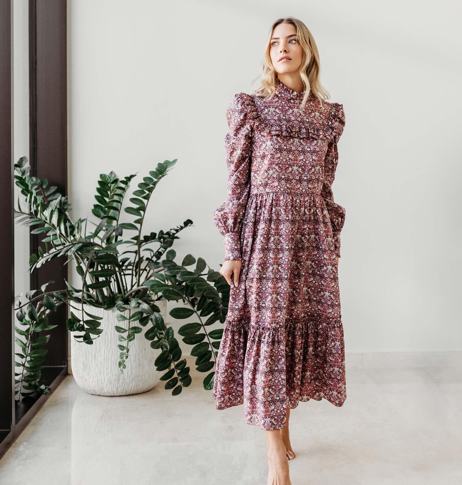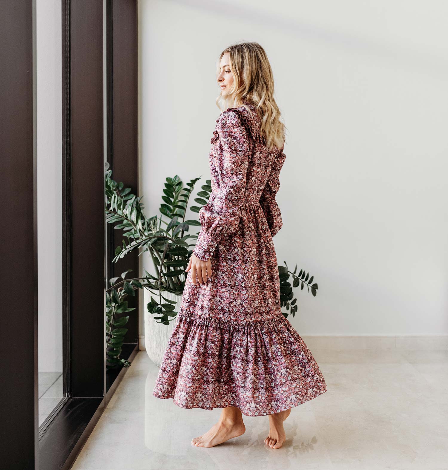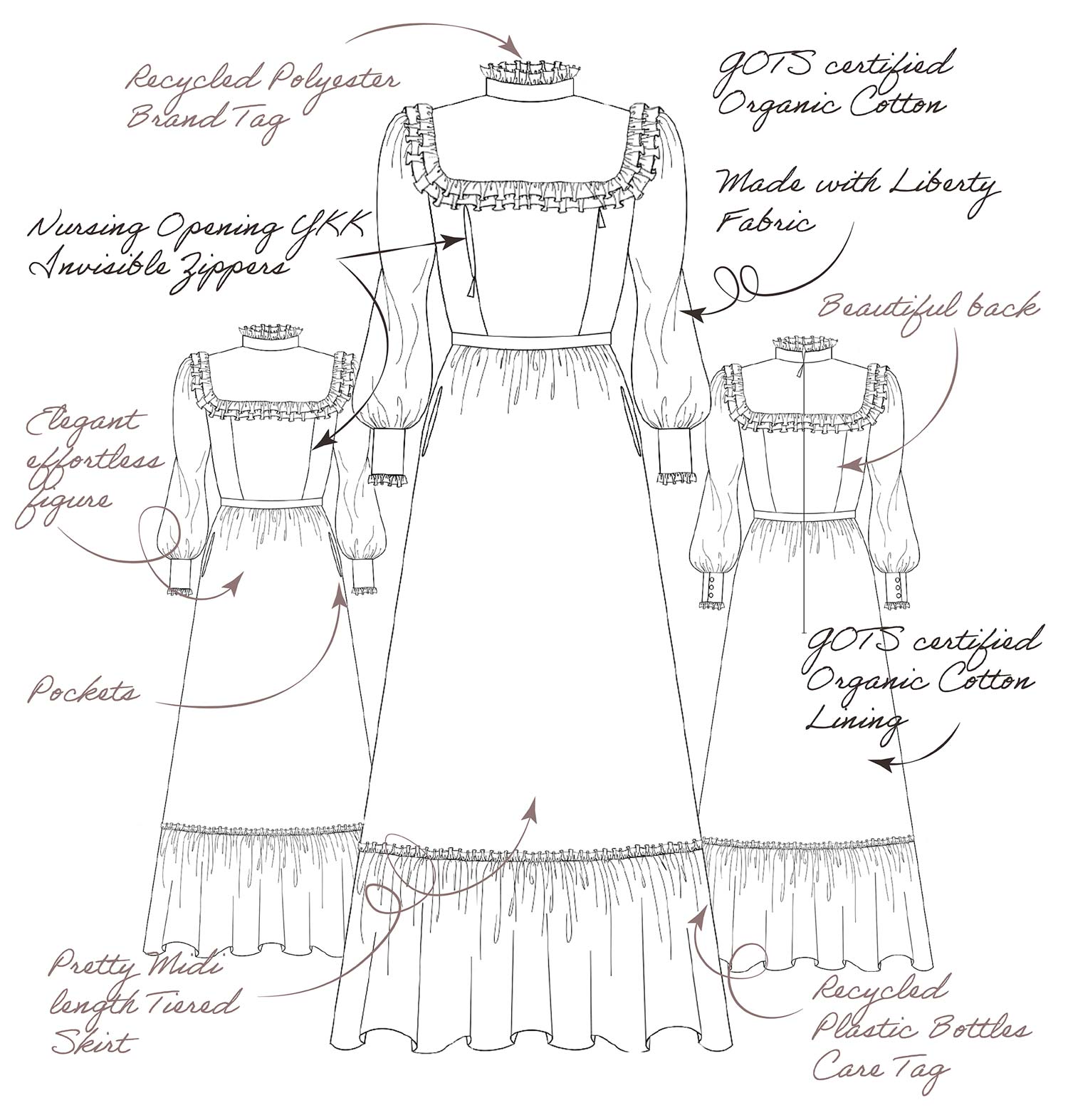 With a uniquely sculptural design, our Belle Nursing Dress is a work of art. We chose an intricate burgundy floral for this prairie-style midi dress, adorned with a high-necked ruffled collar, a defined waist, and a ruffled chest panel that hides two nursing zippers. Volume sleeves gather at the cuff for added shape. With its long, organic cotton skirt drifting around you, you’ll feel as if you’ve stepped inside a plein air painting—or like picking up a paintbrush of your own.